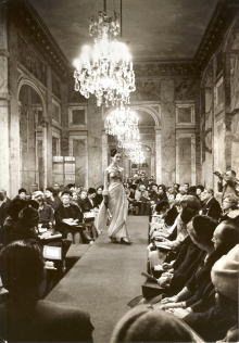 | 縞柄・きものとコートとドレスの アンサンブル(1963年)パリ・クリヨン ホテルでのショー風景 |