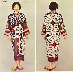 (眼の形の意) や「モレウ」と呼ばれるアイヌ独特の模様を縫いあらわしたり、藍木綿を切抜いてアップリケしたりするようになった。その後、白、赤、褐色などの色を用いるようになって、衣生活を豊富にしていったのである。このような文化の取り入れ方は、台湾の高砂族における赤毛布や色毛糸の利用とよく似ていて興味深い。 (保育社発行 田中薫 田中千代 共著「原色世界衣服大図鑑より」) |