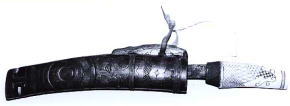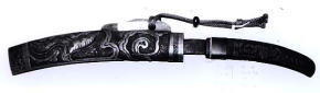![]() アイヌはこれをエピリケップと言う 木彫の鞘に角の柄 鞘 長さ22cm巾3.5cm 柄 長さ10cm |