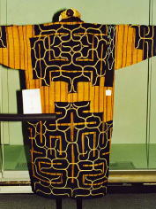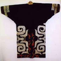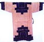 ![]() 楡科のオヒョウダモの靭皮繊維で織った布による衣服、平織 木綿布の切伏せにシクノカ (眼紋) の刺繍 |