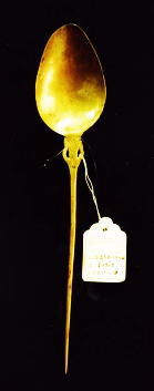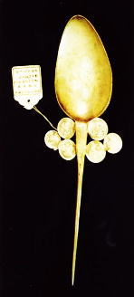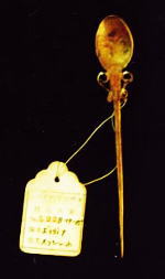 装飾を兼ねた留ピンとして、又食事時のスプーンとしても使用される 全長 22.5cm 巾太い所で4.3cm |