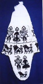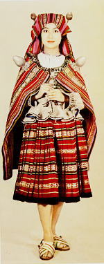| アンデスの高原生活は気温の日較差(15度位)が大なので厚地の毛織物と、重ね着と防風用のポンチョ、それにチュユ(chuyu)男性用の耳隠し付帽子)等が発達している。ポンチョは代表的なアンデスの服型で、一般にはリャマ(llama)など家畜の毛織物で作るが、上等なものはアルパカ(alpaca)、さらに上等のものはビキュニア(vicuna)の毛織物で作られヨーロッパ系の住民のおしゃれを兼ねた外套にもなっている。 (保育社発行 田中薫、田中千代共著「世界のきもの」より) |