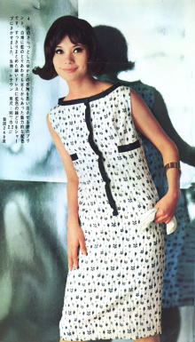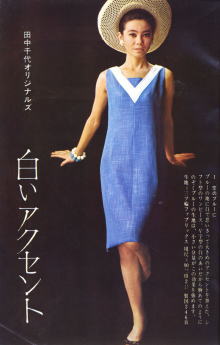| (7月号) 「プリントのたのしみ」 白地に紺の絣柄プリントの細い ドレス |