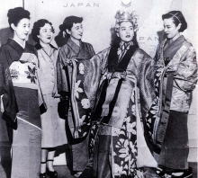 | 1950年9月●ニューヨークの ブルックリン・ミュージアムでニュー キモノと伝統衣装のショーを行う 右から山口淑子さん(李香蘭) 伊藤テイコ夫人、千代、 峰島夫人(オペラ歌手宮川美子さん) 湯川秀樹氏夫人スミさん |